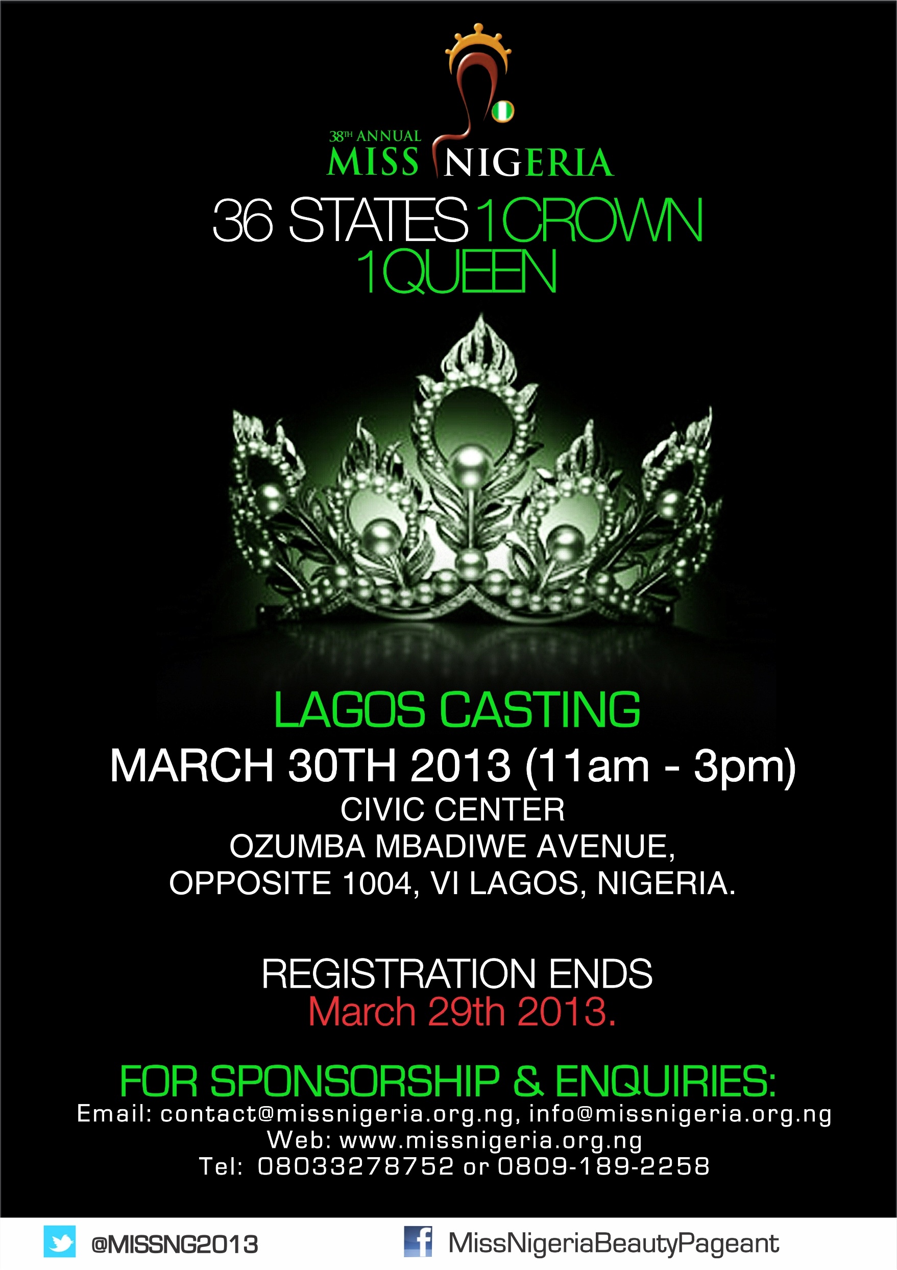 Also like us on Facebook www.facebook.com/MissNigeriaBeautyPageant and follow us on Twitter www.twitter.com/MISSNG2013